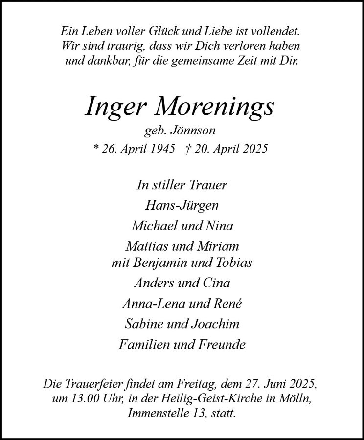 Inger Moreningsgestorben am 20. April 2025